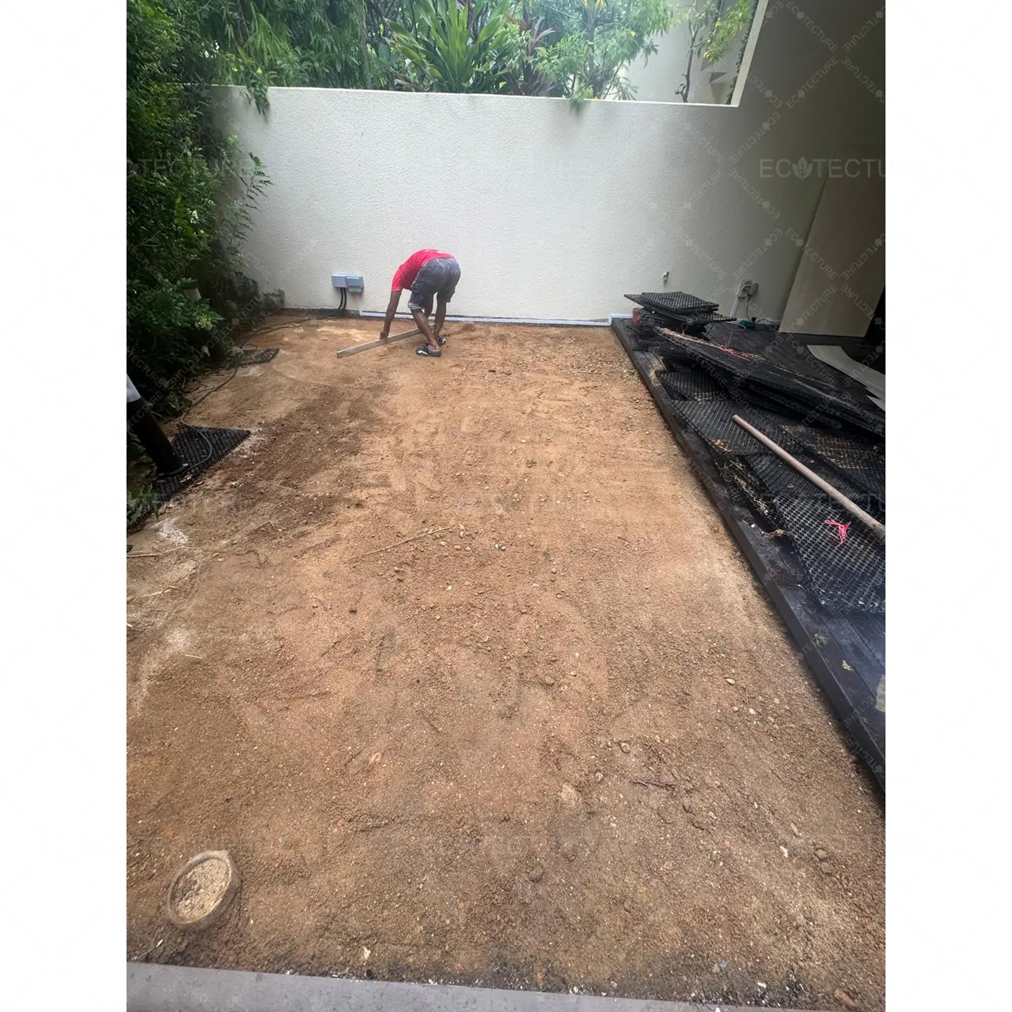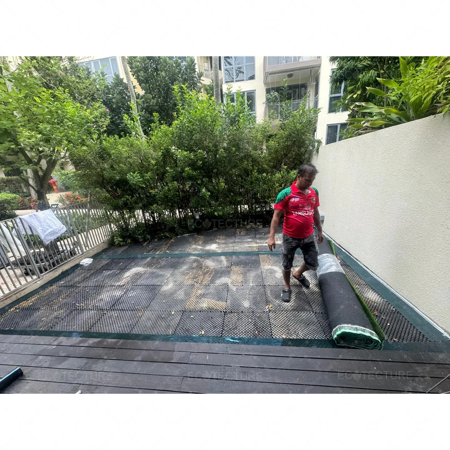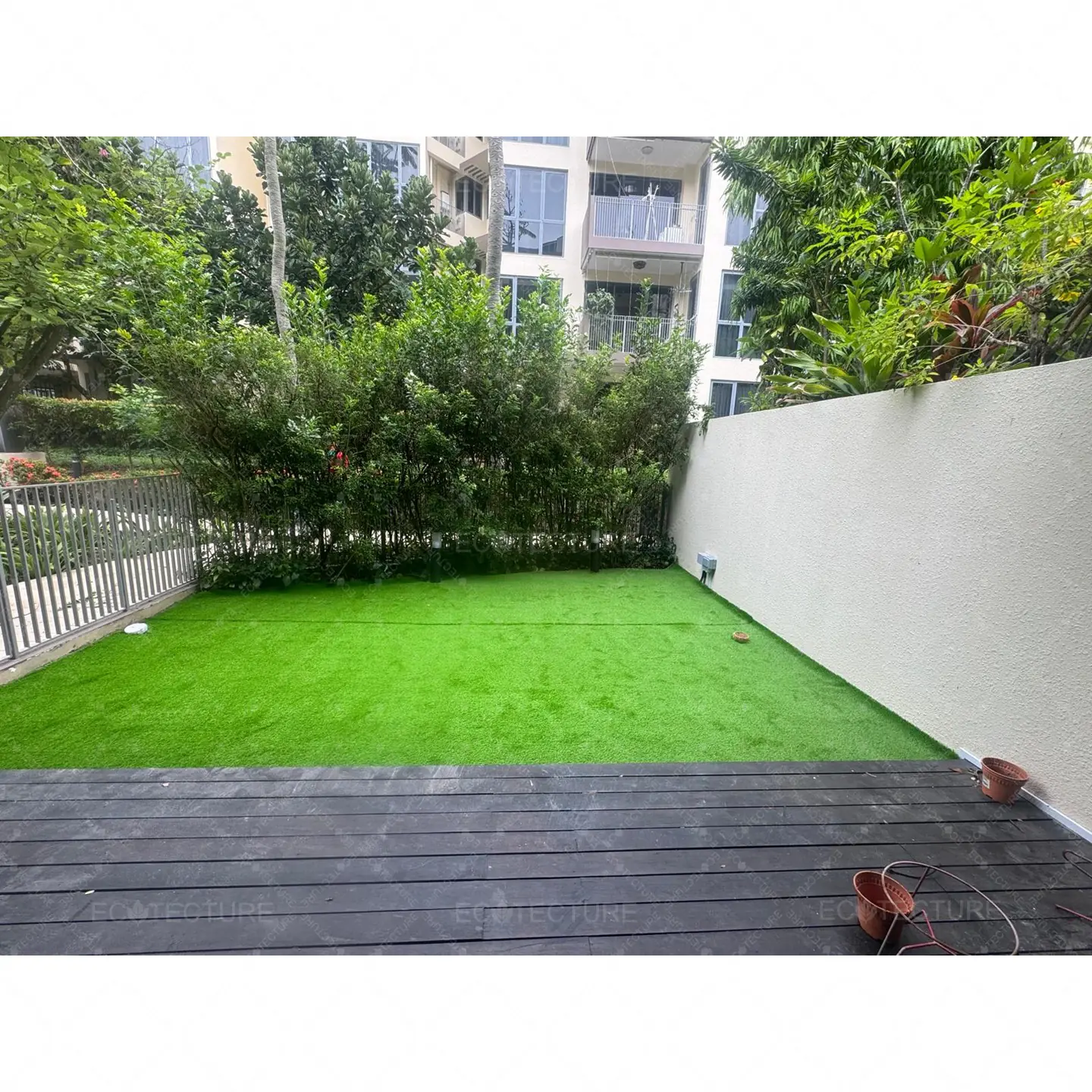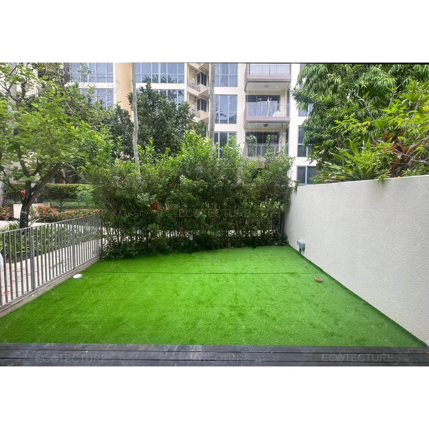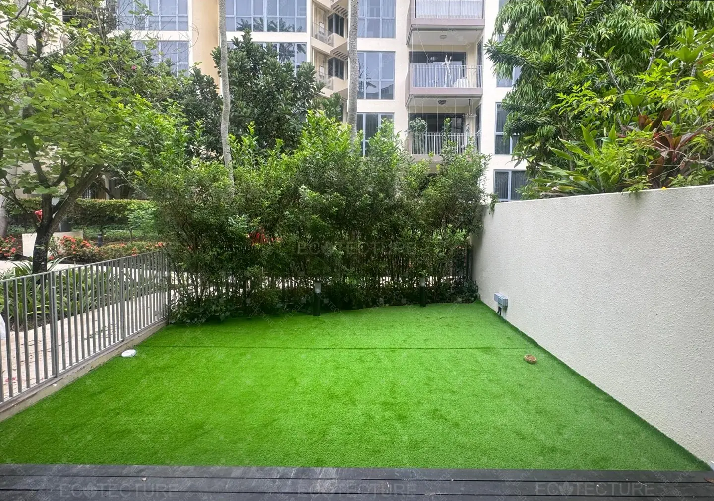 A patio garden enhancement at Condominium Palm Isles featuring EcoSignature 30mm Artificial Grass Installation. This installation transforms the outdoor patio into a lush green space, creating a refreshing and inviting garden area for relaxation and daily enjoyment.