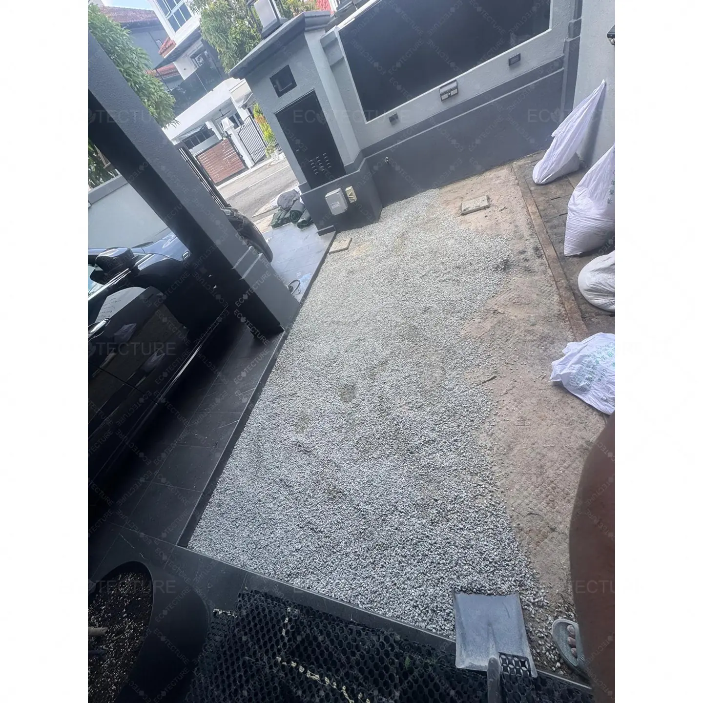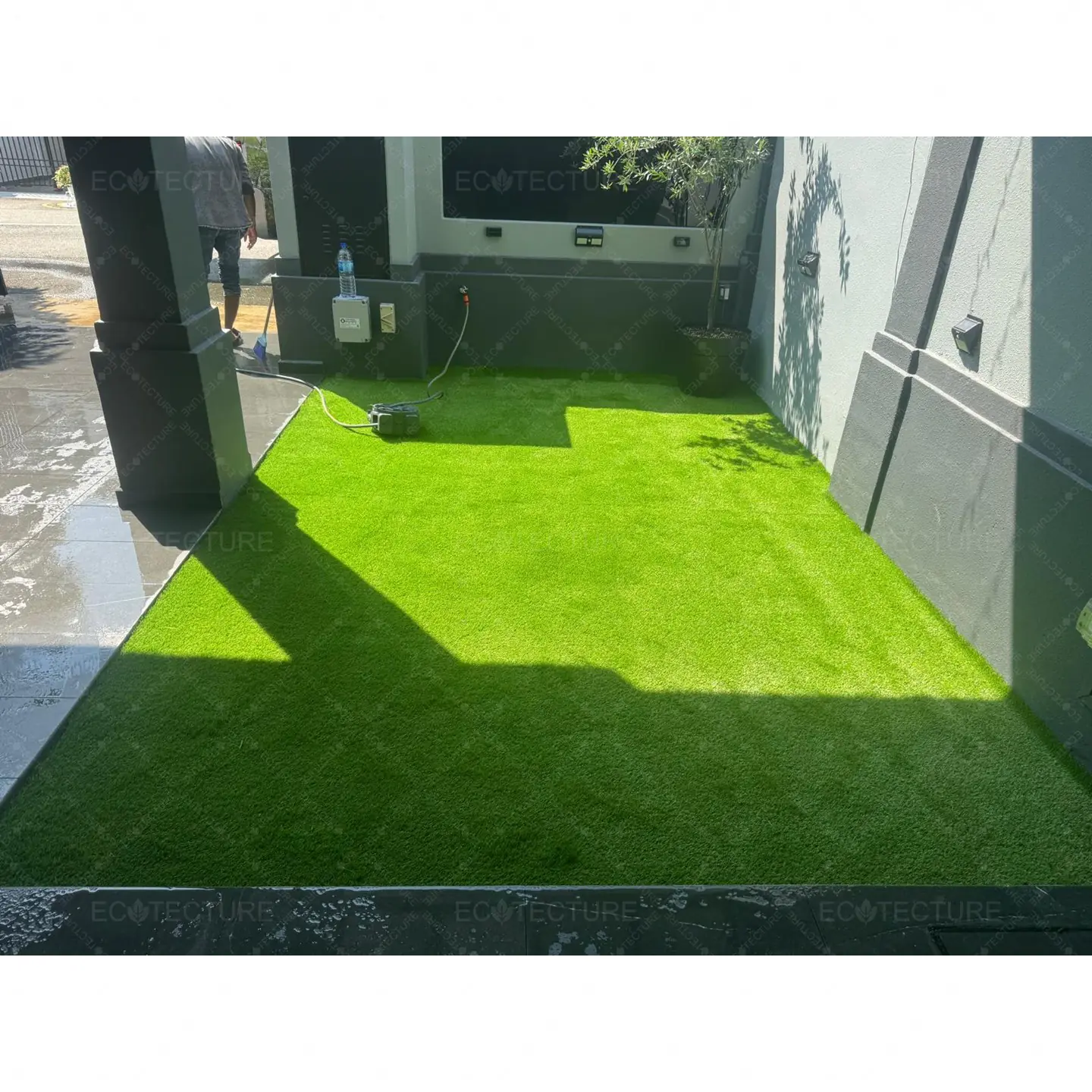 An outdoor front garden enhancement at LANDED HOUSE Loyang featuring EcoPro 35mm Artificial Grass Installation. This installation transforms the frontage into a lush and natural-looking green space, enhancing the overall curb appeal while keeping the area neat and well-presented.