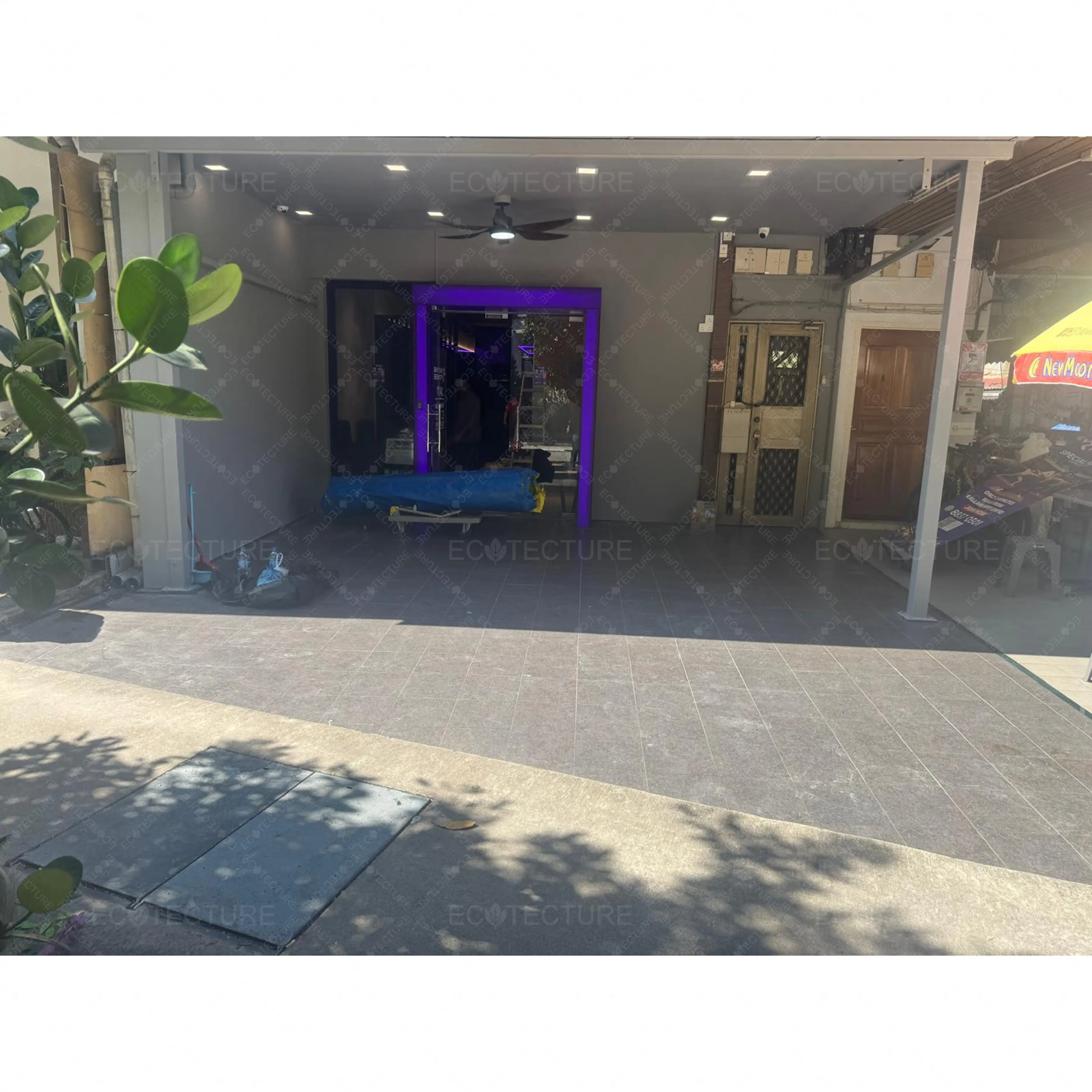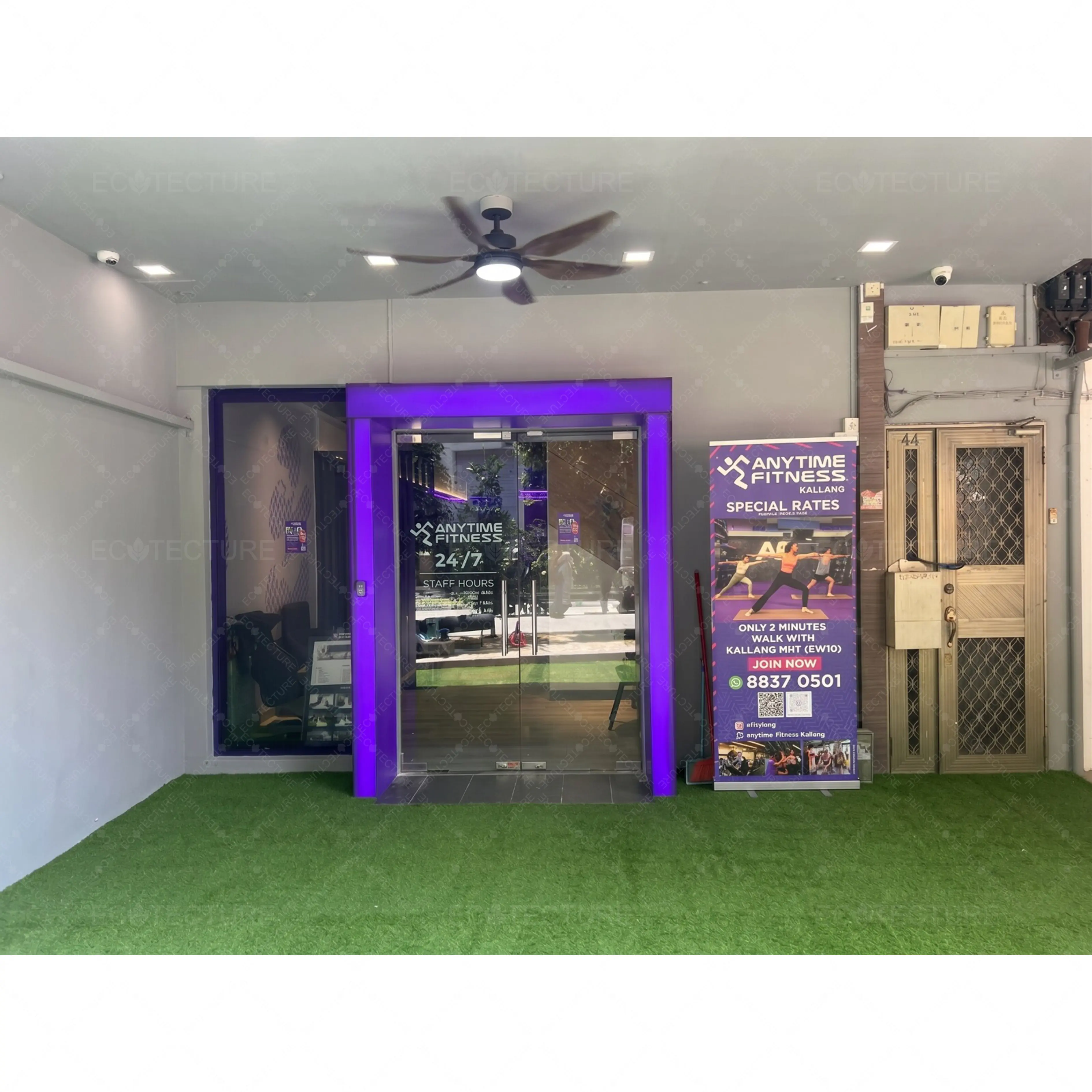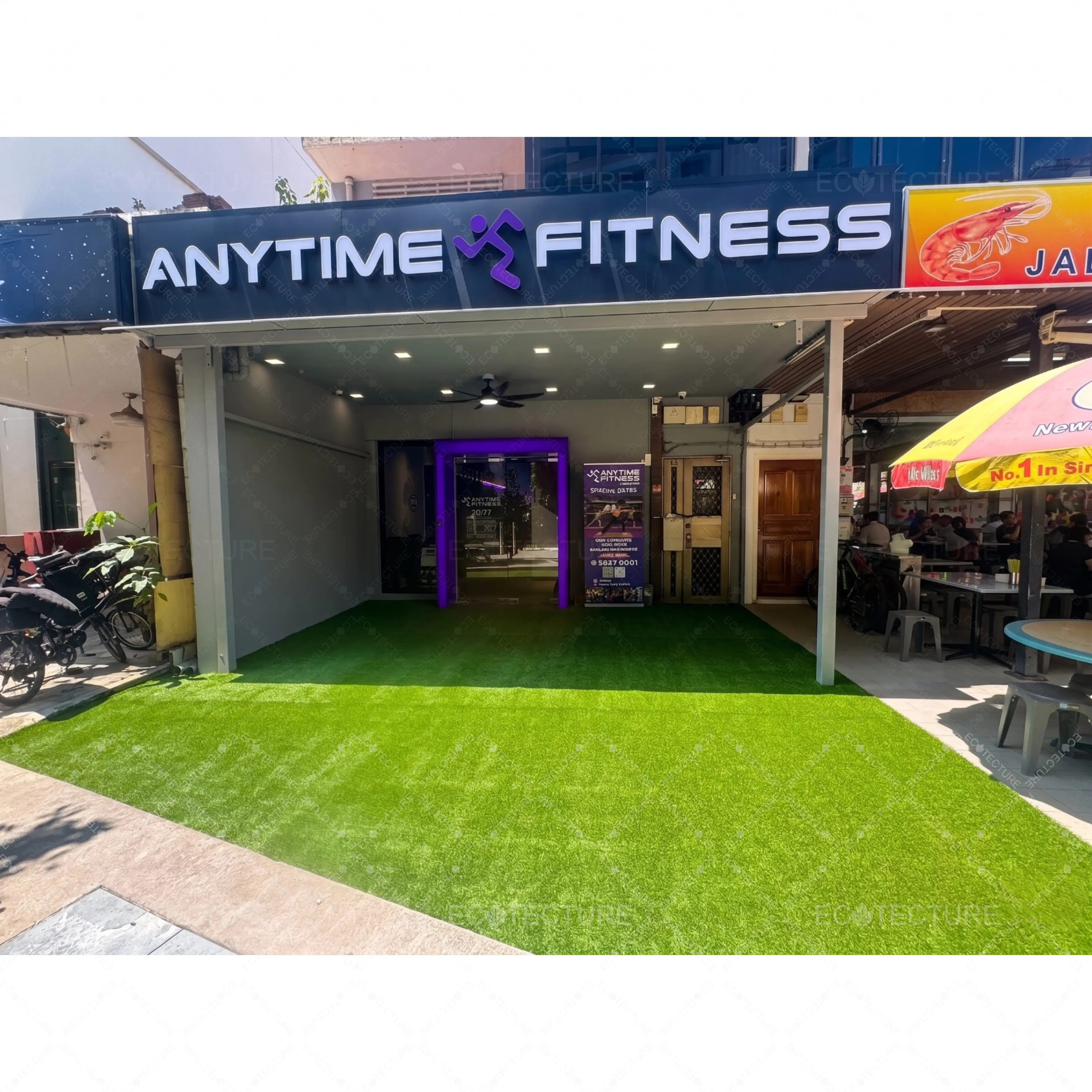 An outdoor entrance enhancement at Anytime Fitness Kallang featuring EcoLawn 20mm Artificial Grass Installation. This installation introduces a clean and refreshing green surface, creating a more inviting entrance while complementing the fitness environment.
