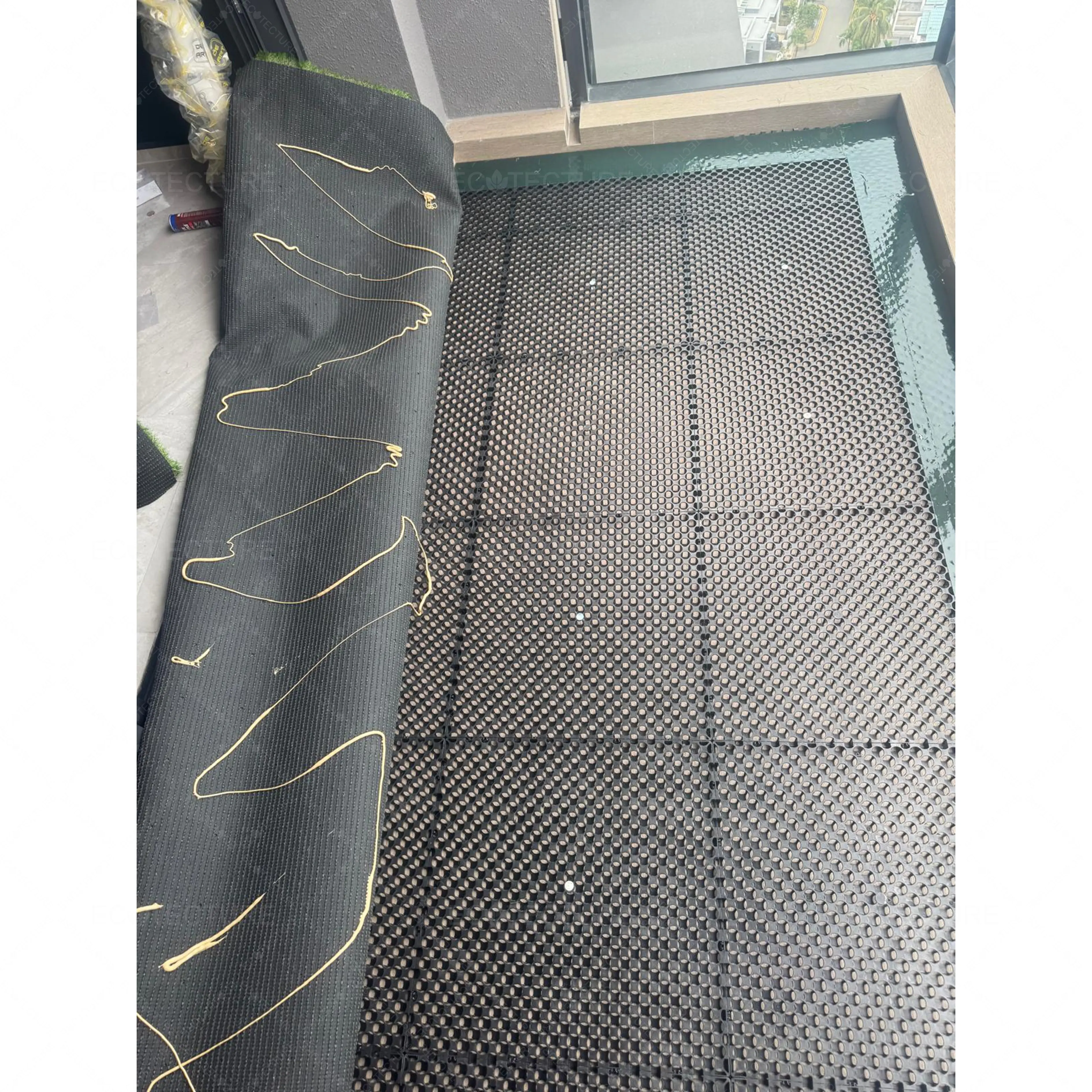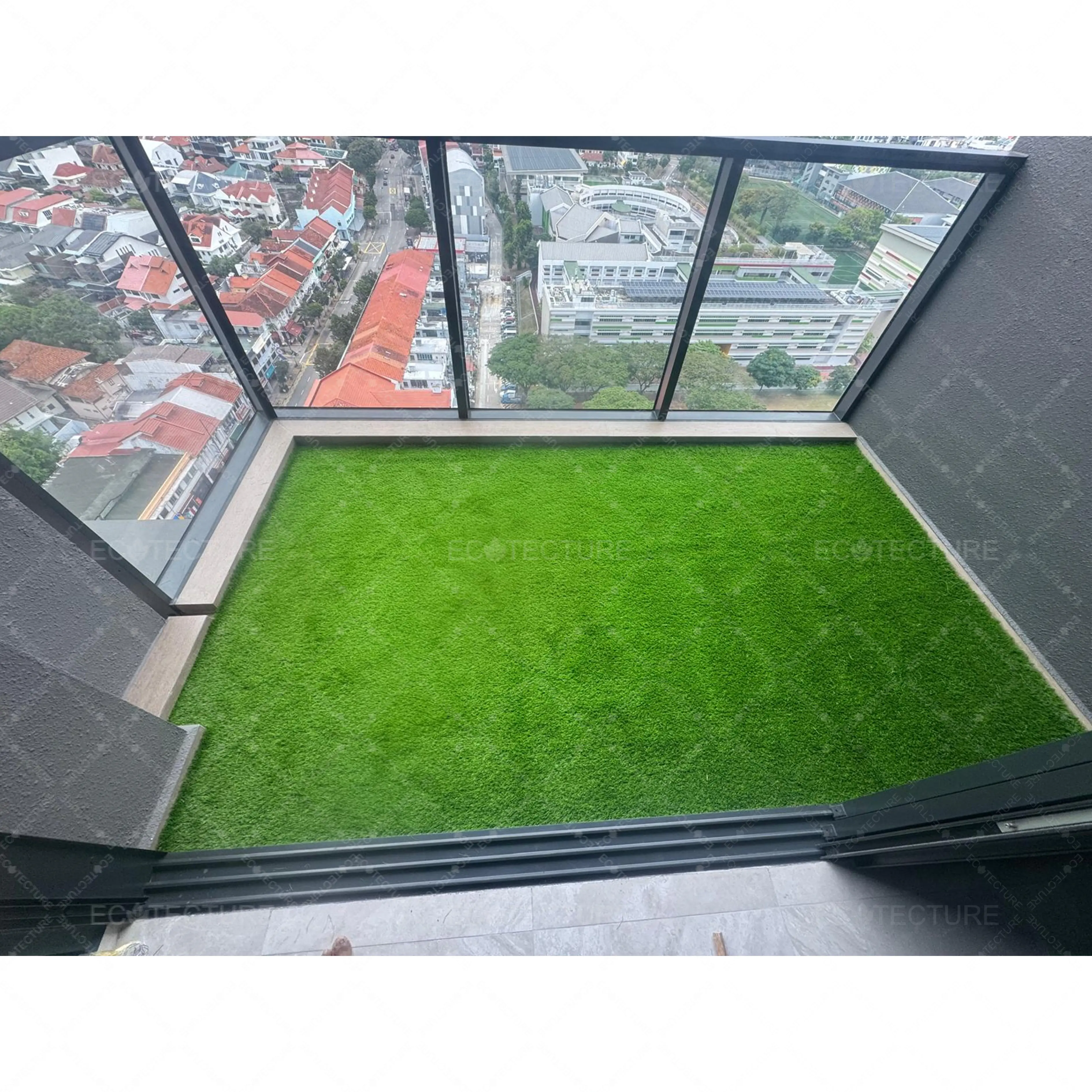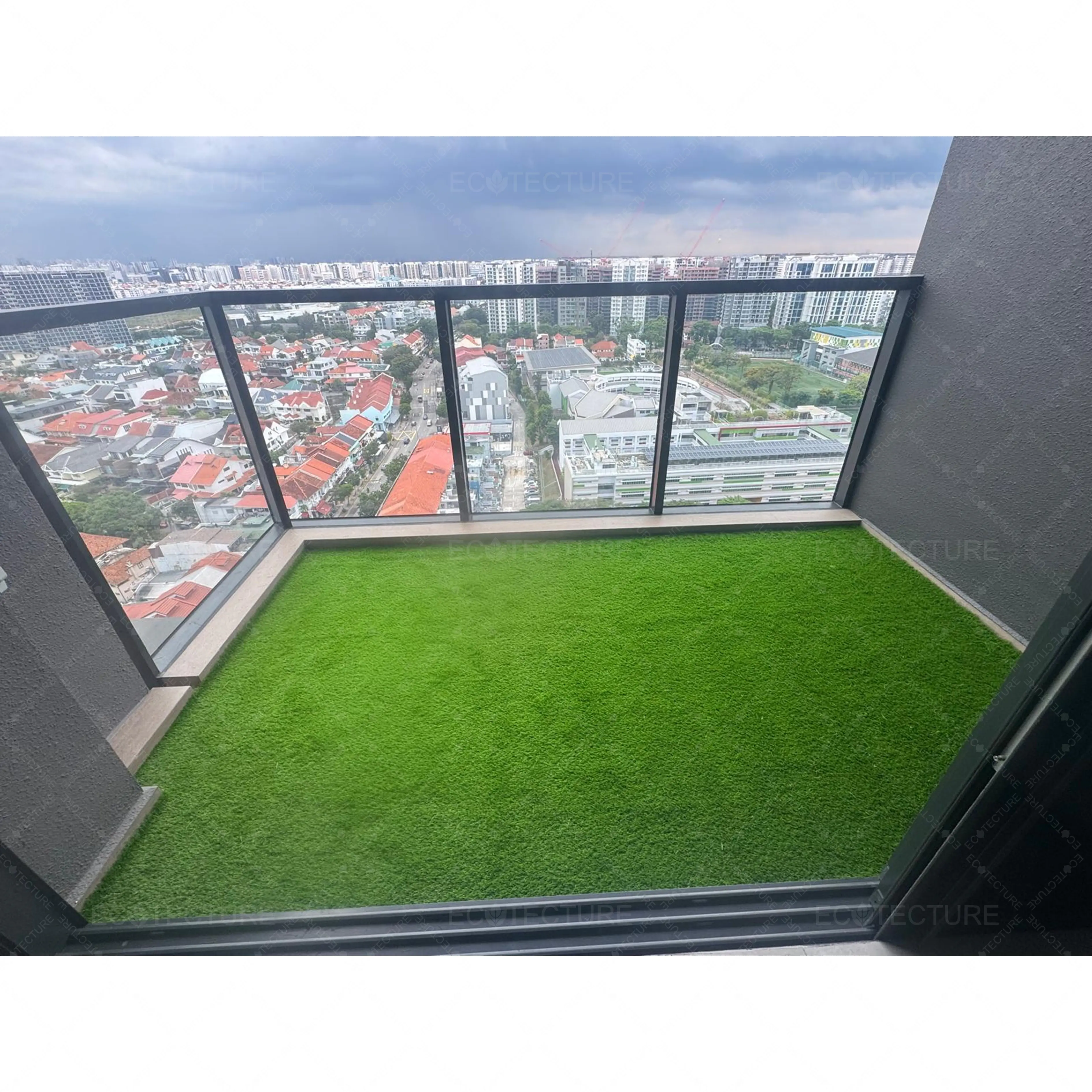 An outdoor balcony enhancement at Condominium Tembusu Grand featuring EcoSignature 30mm Artificial Grass Installation. This installation transforms the balcony into a lush green space, creating a refreshing and inviting outdoor environment for relaxation.