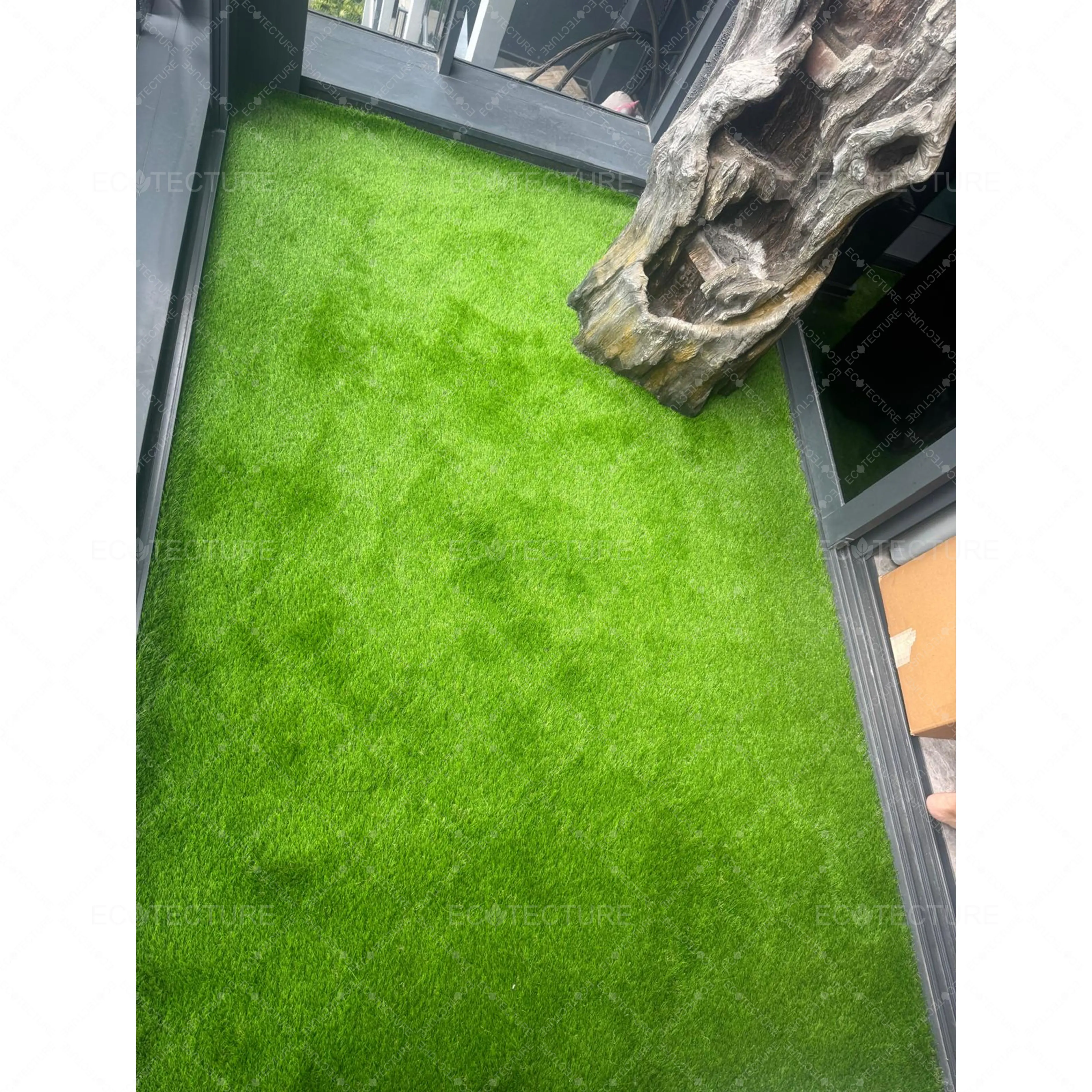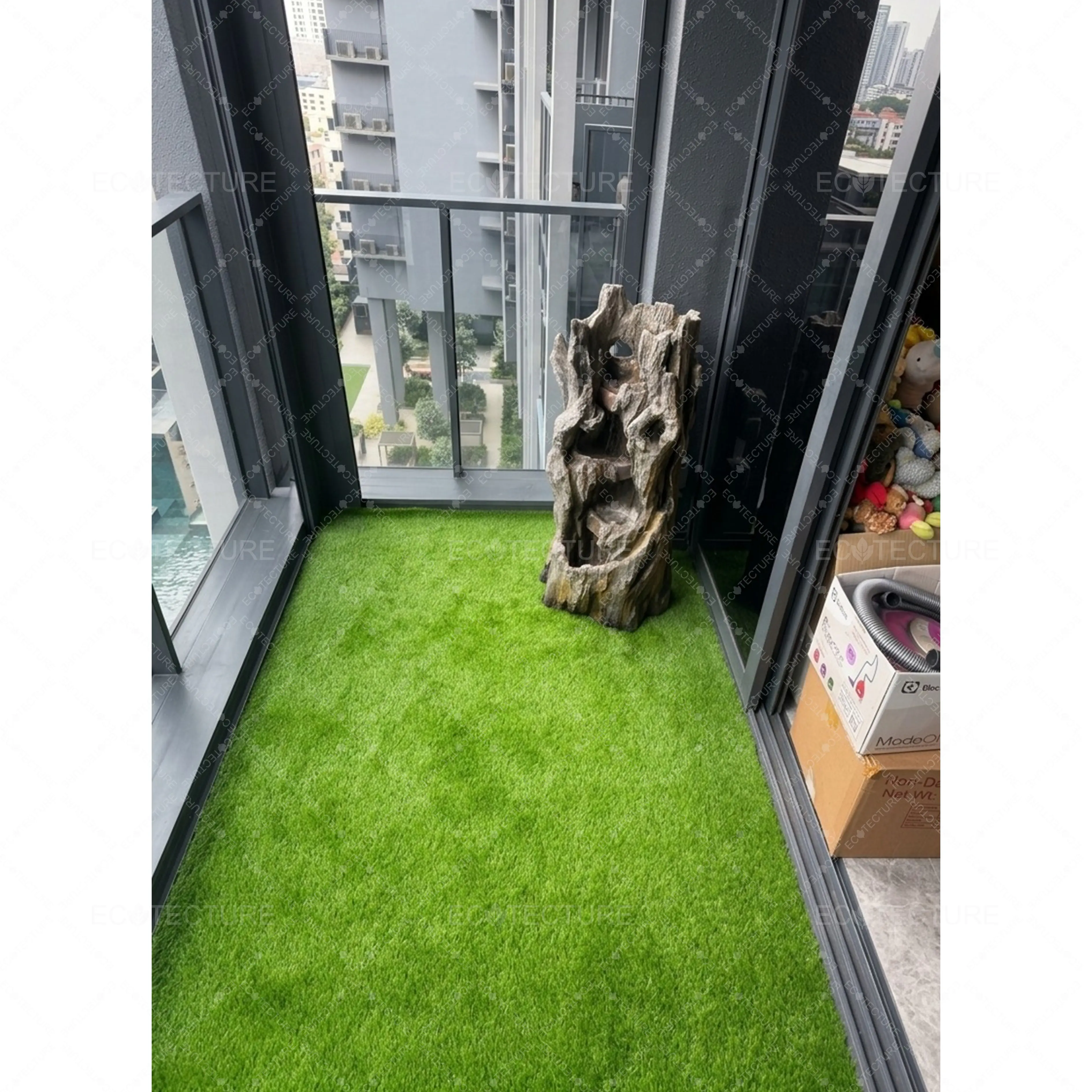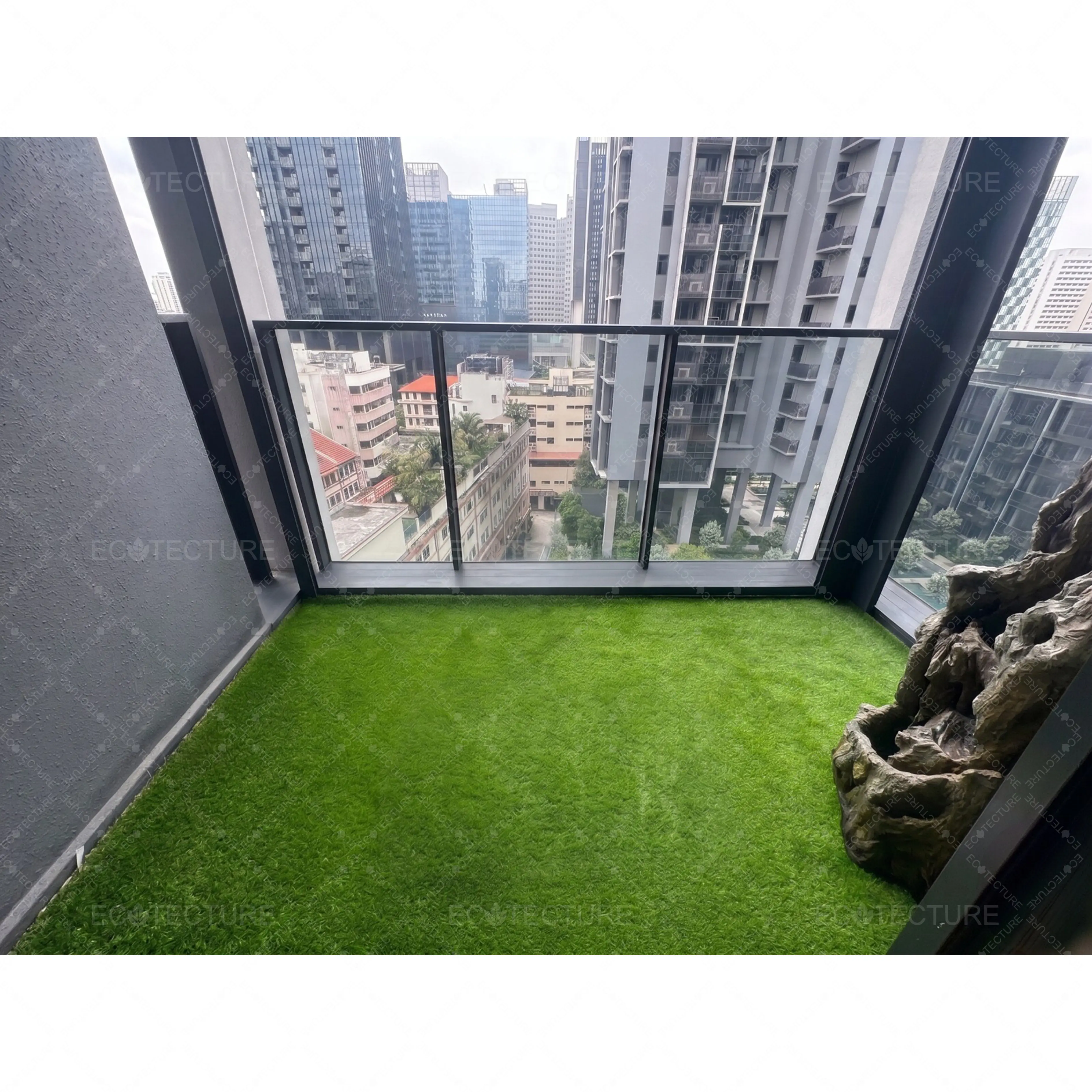 An outdoor balcony enhancement at Condominium The M featuring EcoSignature 30mm Artificial Grass Installation. This installation transforms the balcony into a lush green space, creating a refreshing and inviting outdoor environment for relaxation.
