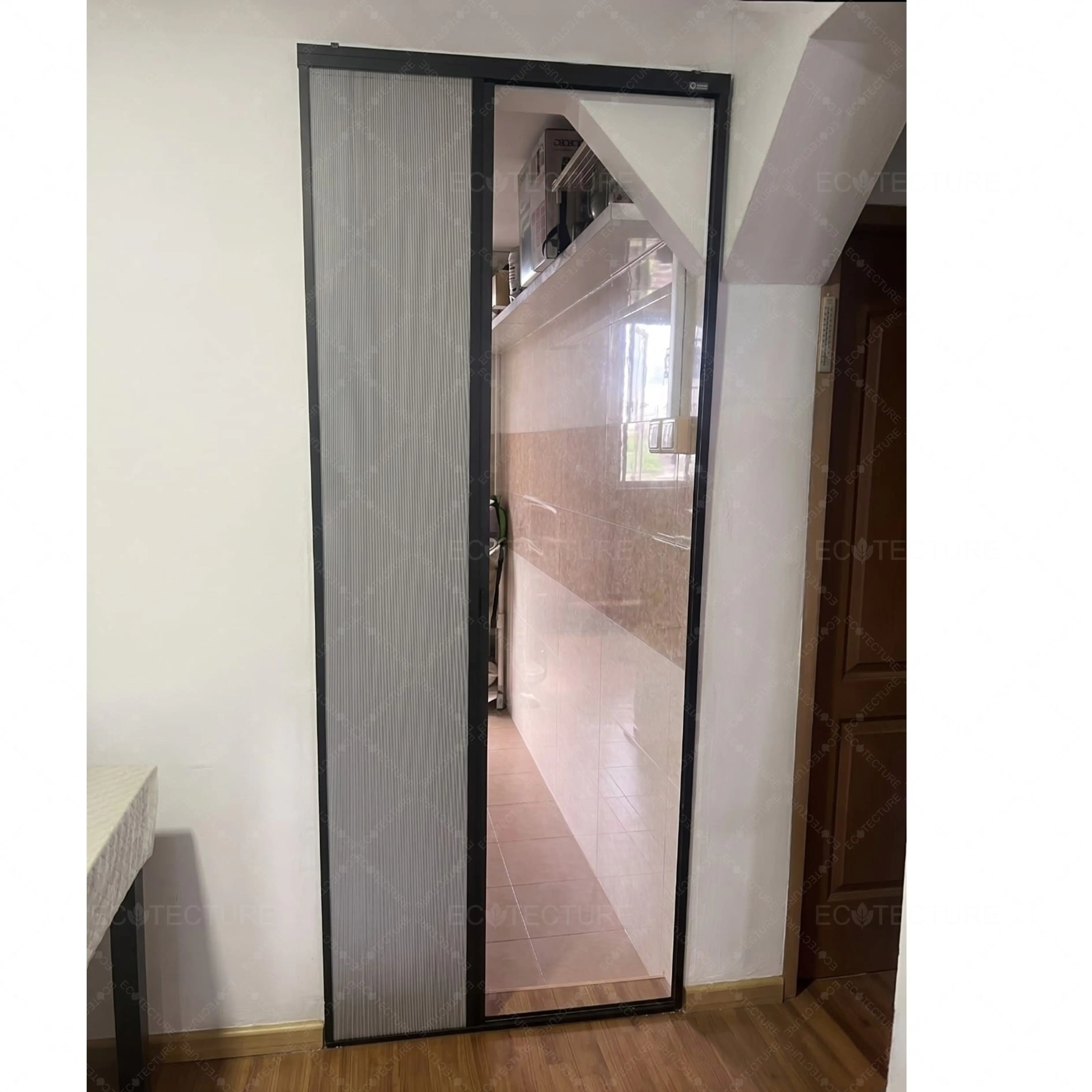 A living room & kitchen transition upgrade at HDB Upper Aljunied featuring a Customised Sliding Door Installation. This installation creates a functional separation between spaces while maintaining a clean and modern interior flow, enhancing both privacy and usability.