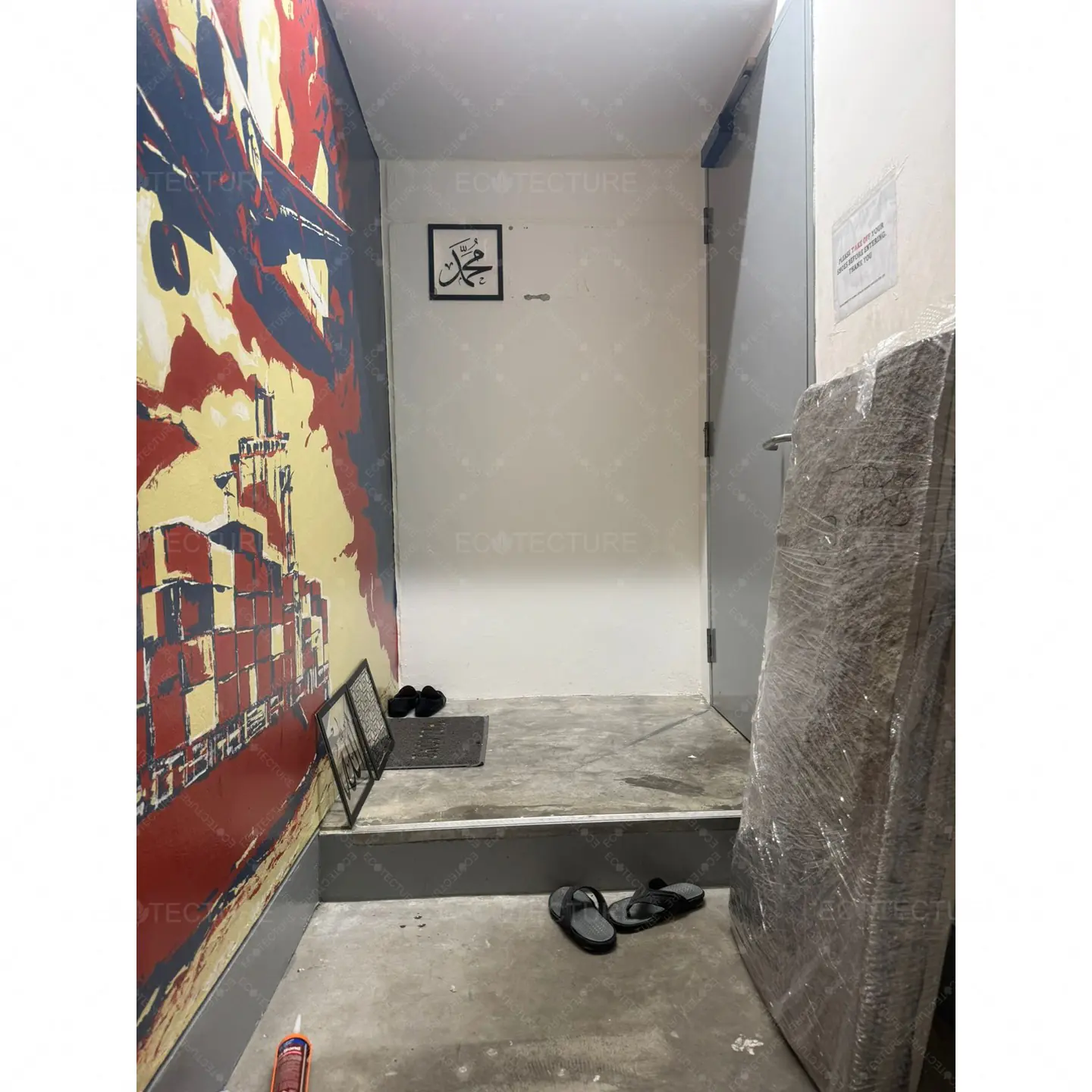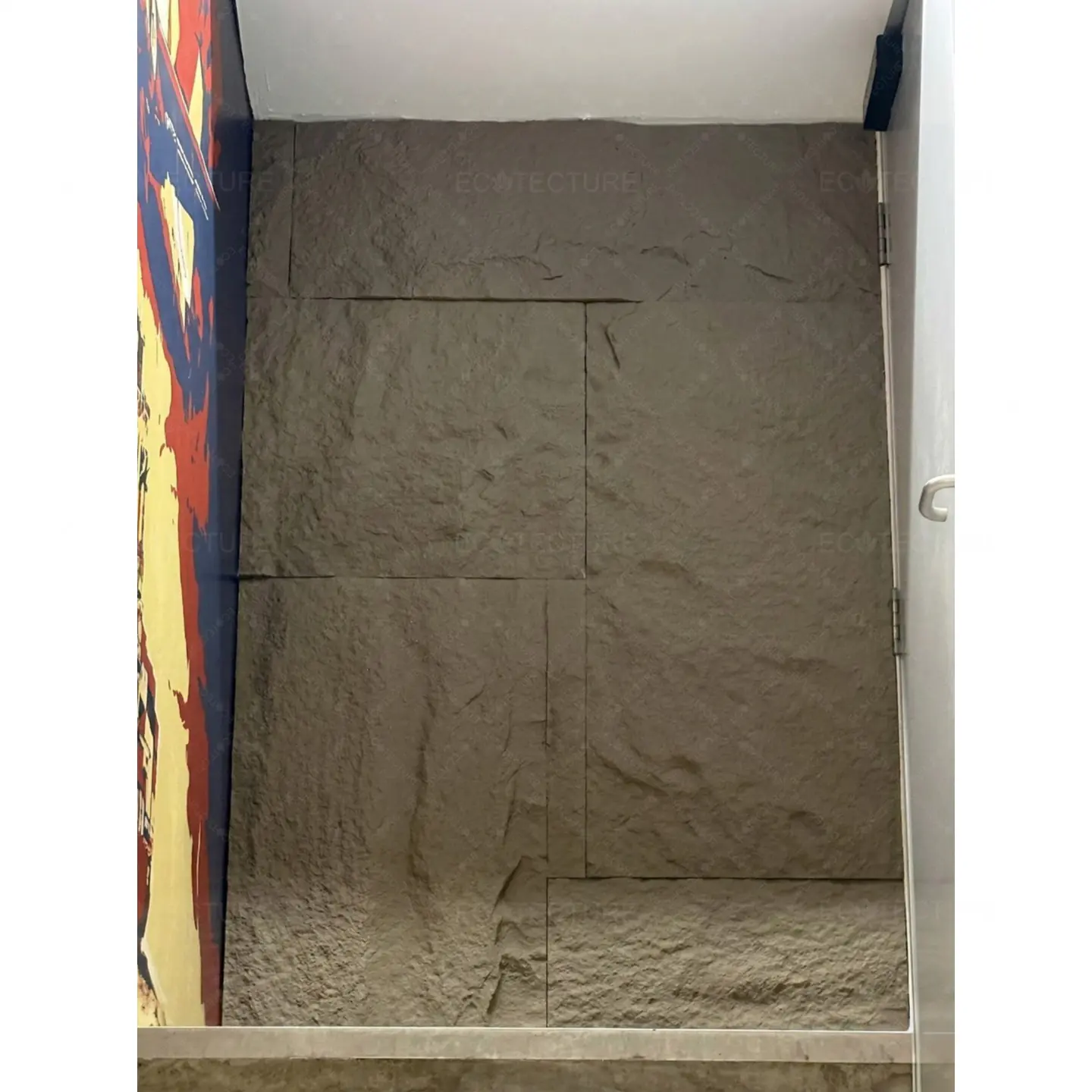 A stairwell entrance enhancement at OFFICE Global Express featuring PU Stone Wall Installation. This installation introduces a textured stone finish, adding depth and character to the space while creating a strong and refined first impression.