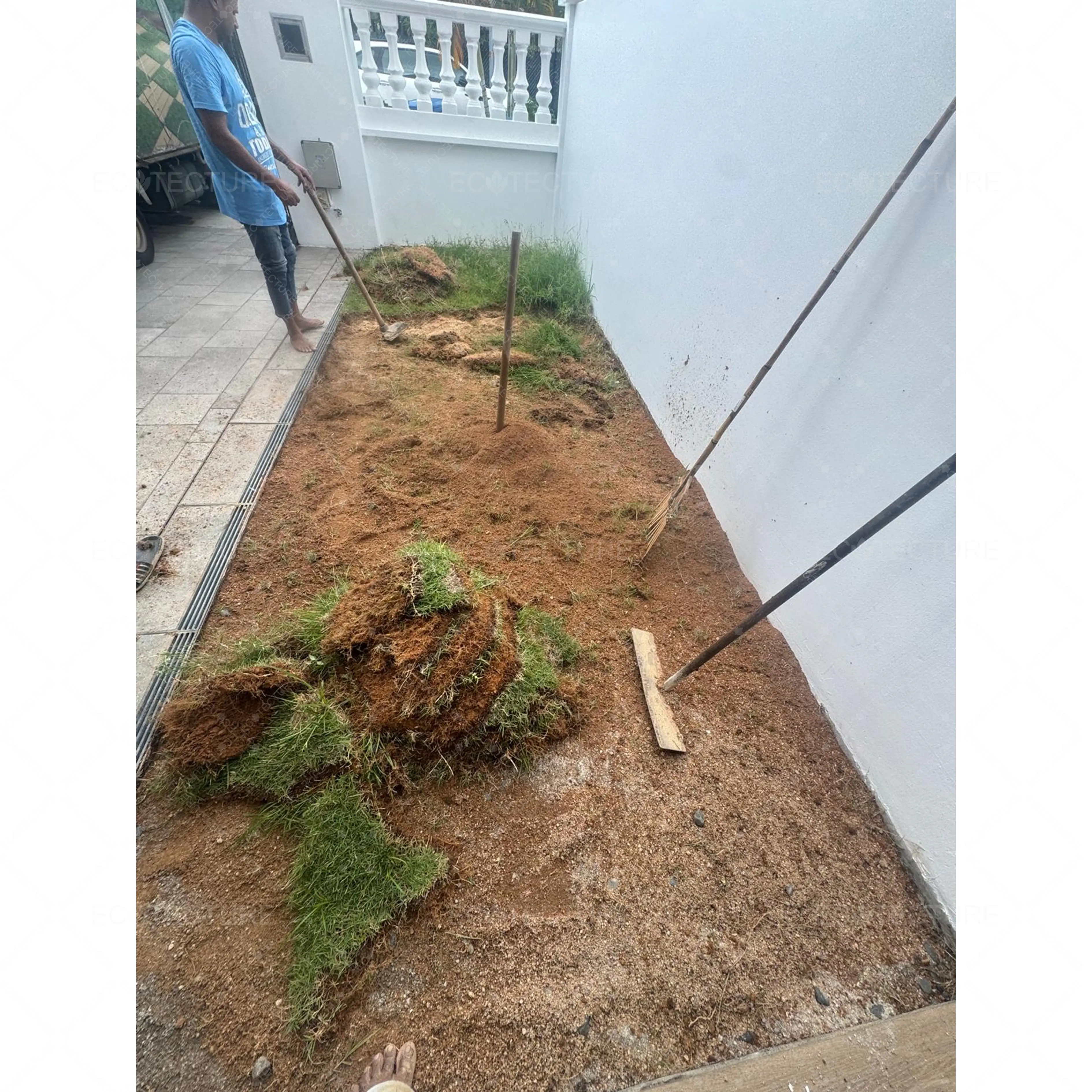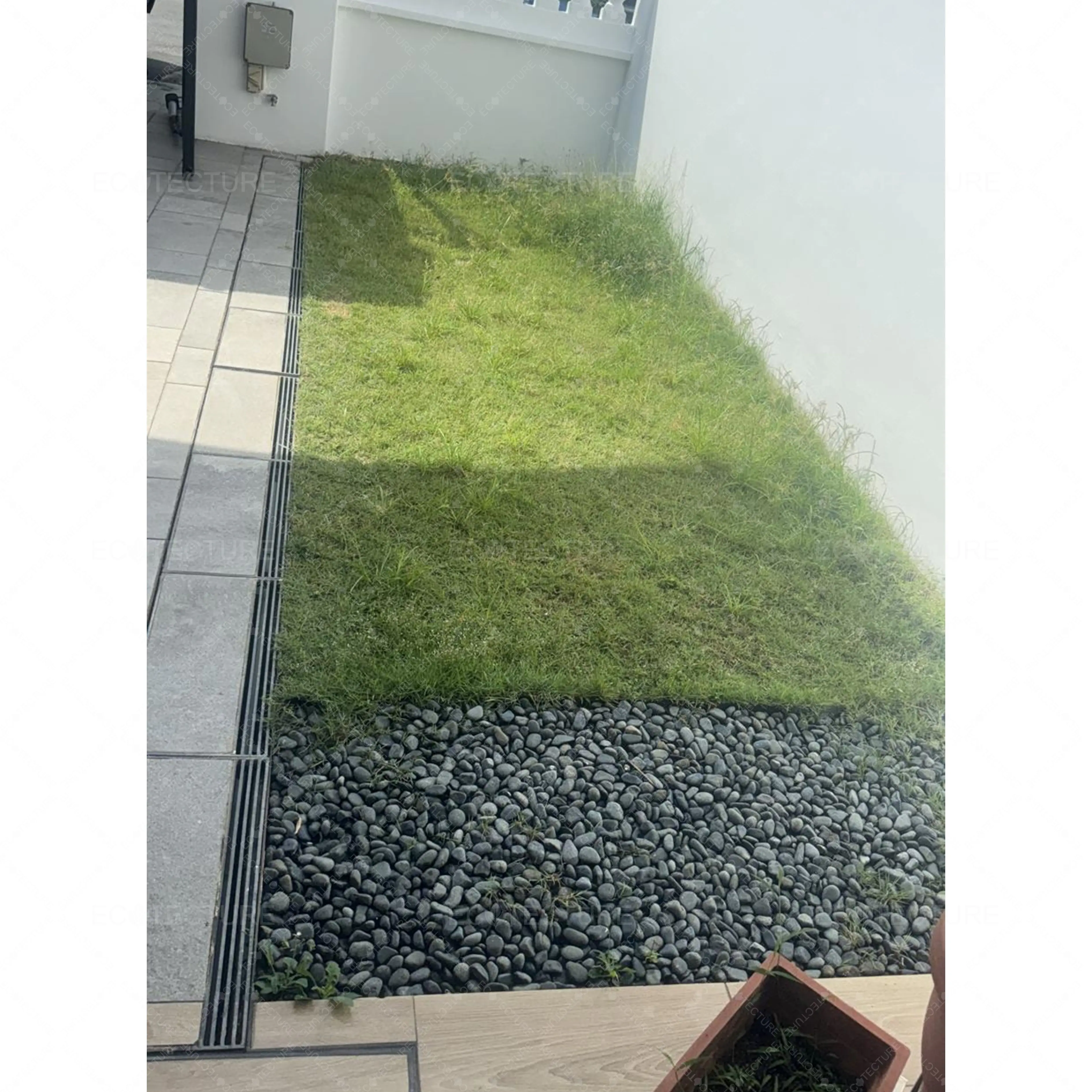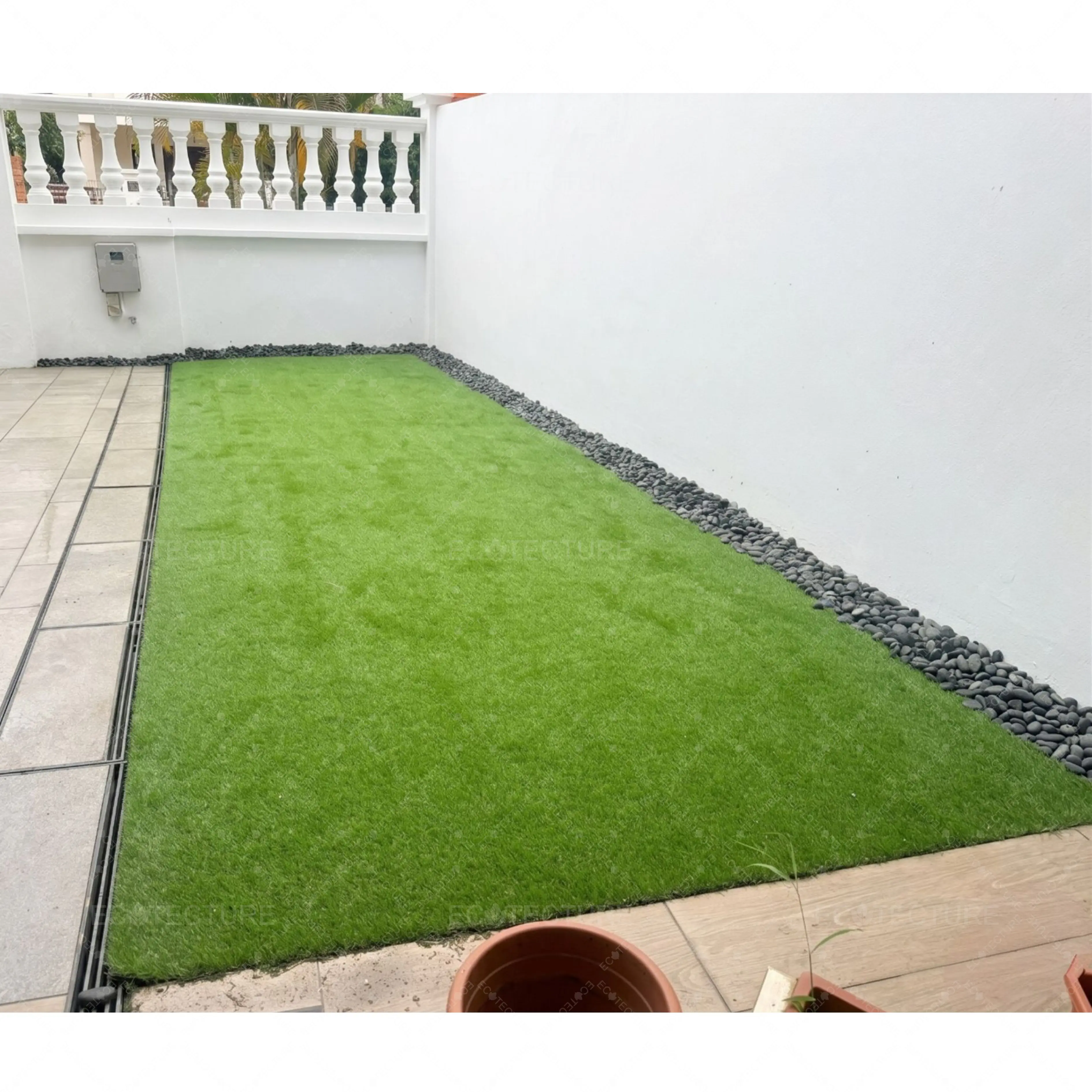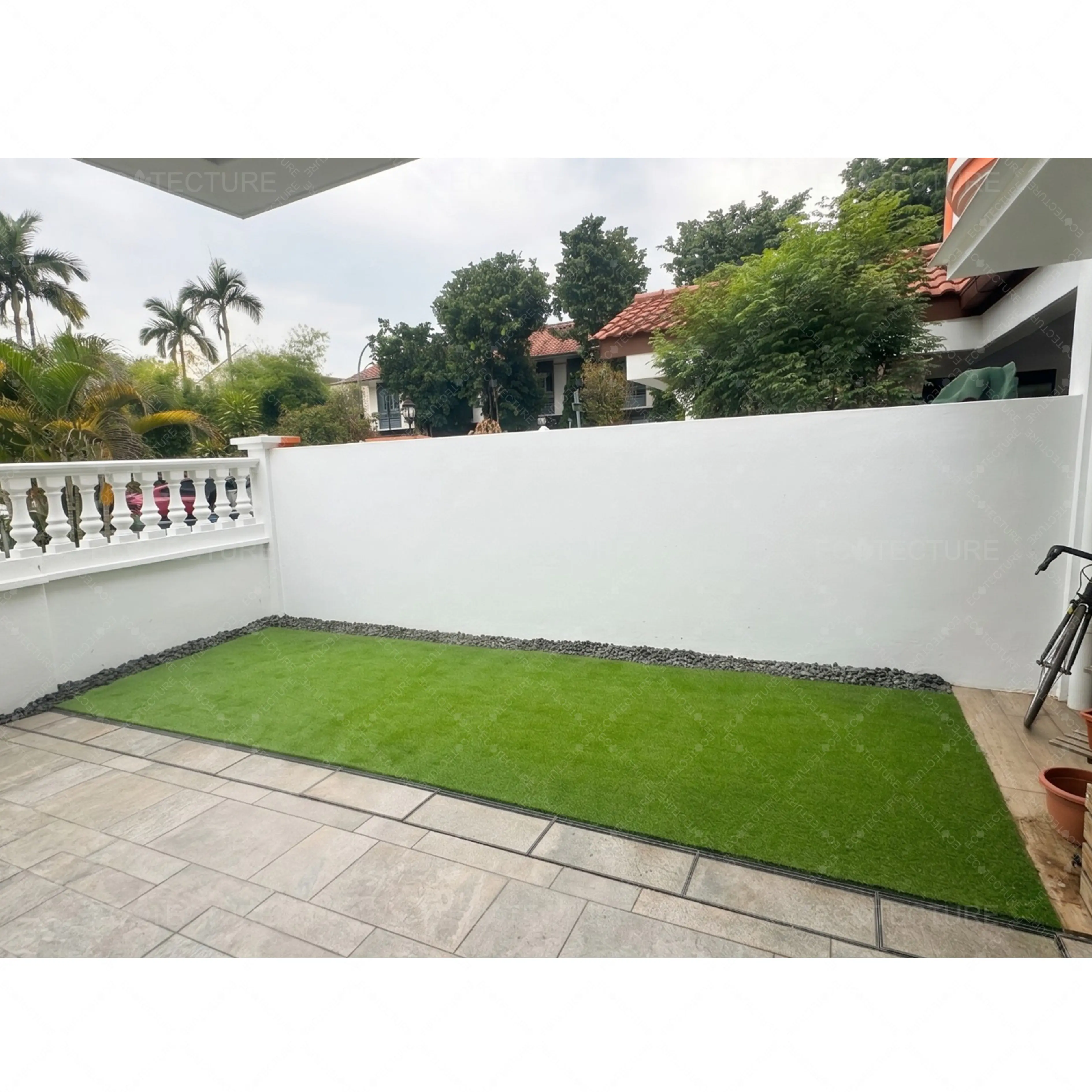 An outdoor front garden enhancement at Terrace House Fudu Park featuring EcoFresh 20mm Artificial Grass Installation. This installation introduces a clean and refreshing green surface, creating a neat and inviting garden space.