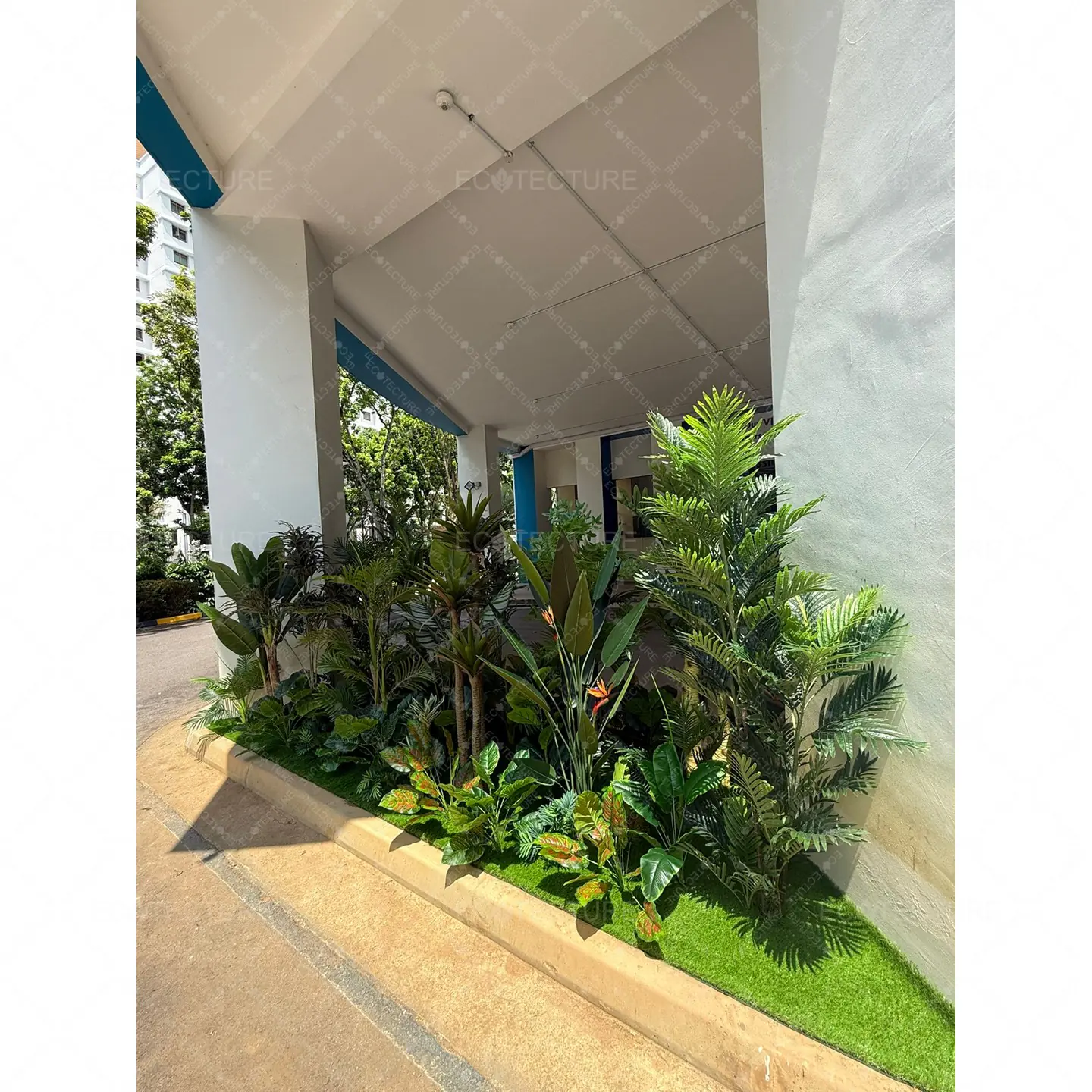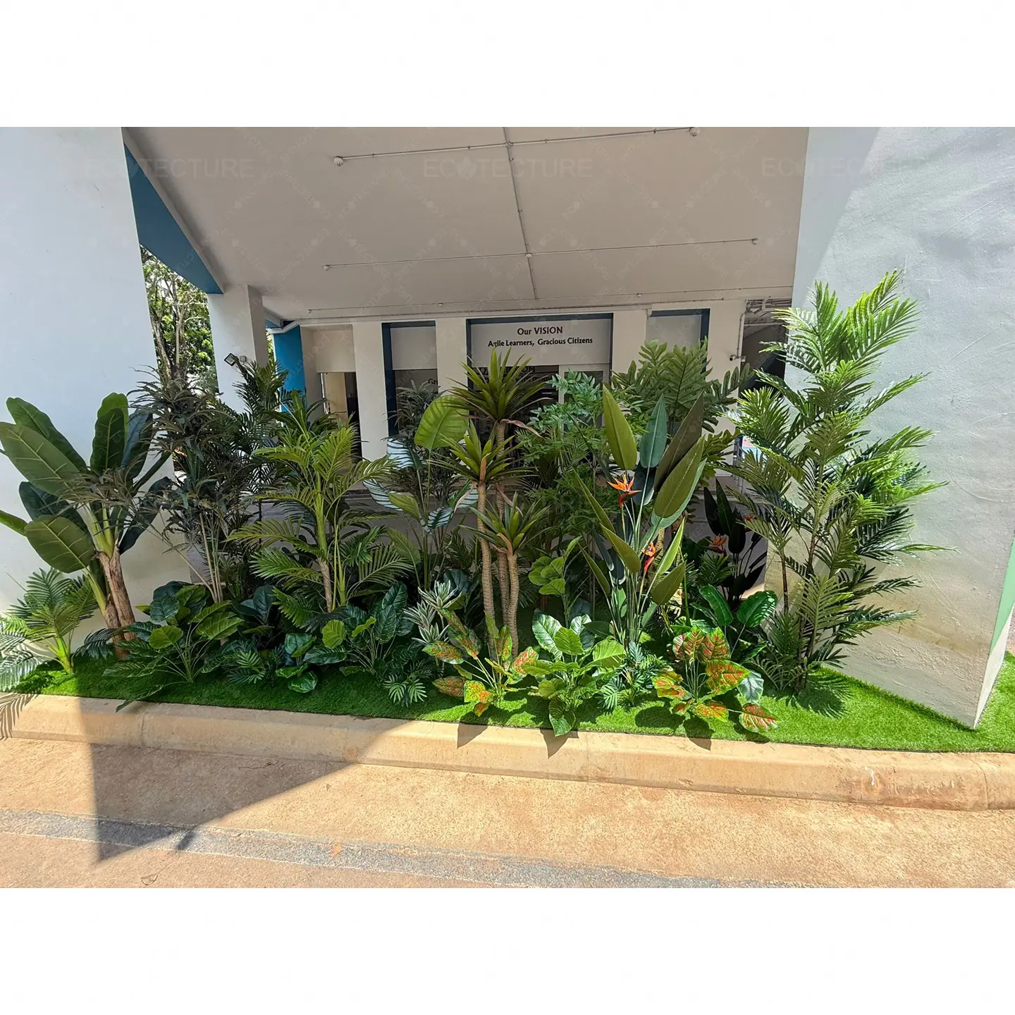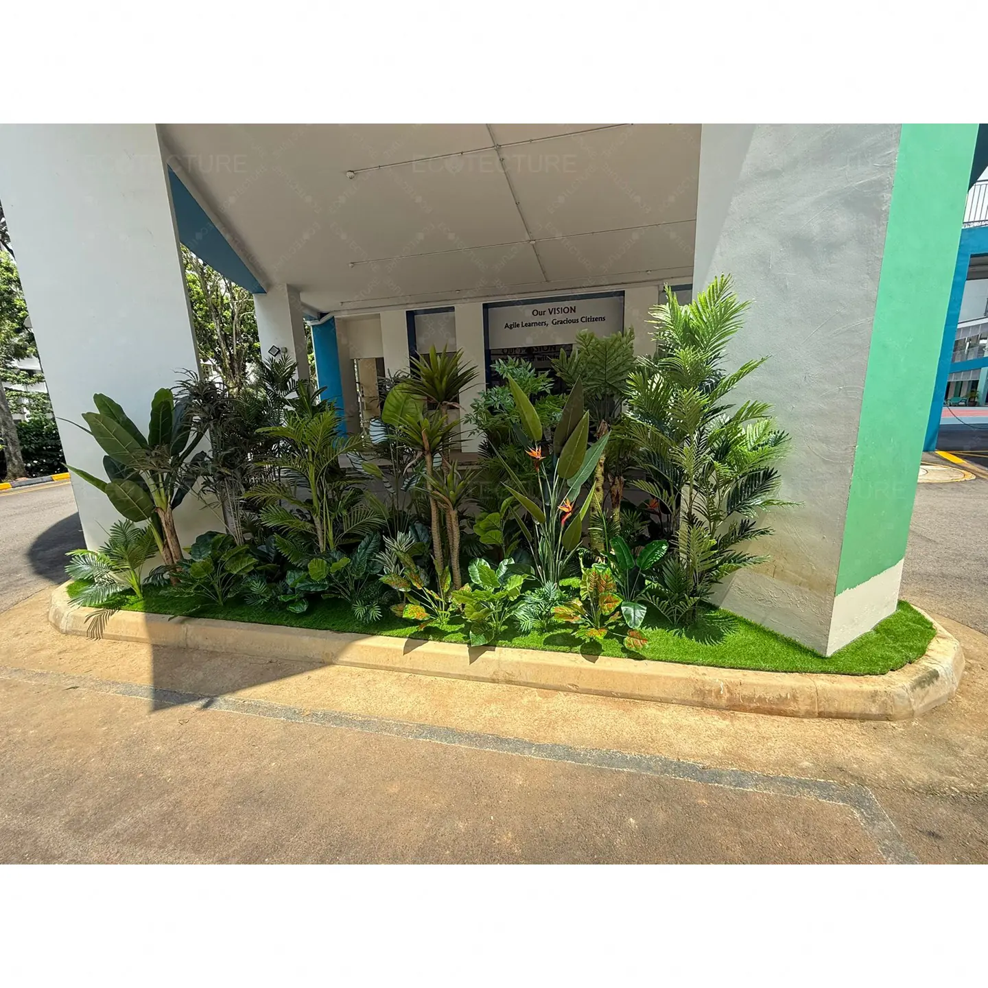 An entrance landscape feature at Anchor Green Primary School featuring Artificial Plant Decor Setting Up. This installation introduces structured greenery to the entrance, creating a vibrant and welcoming environment for students and visitors.