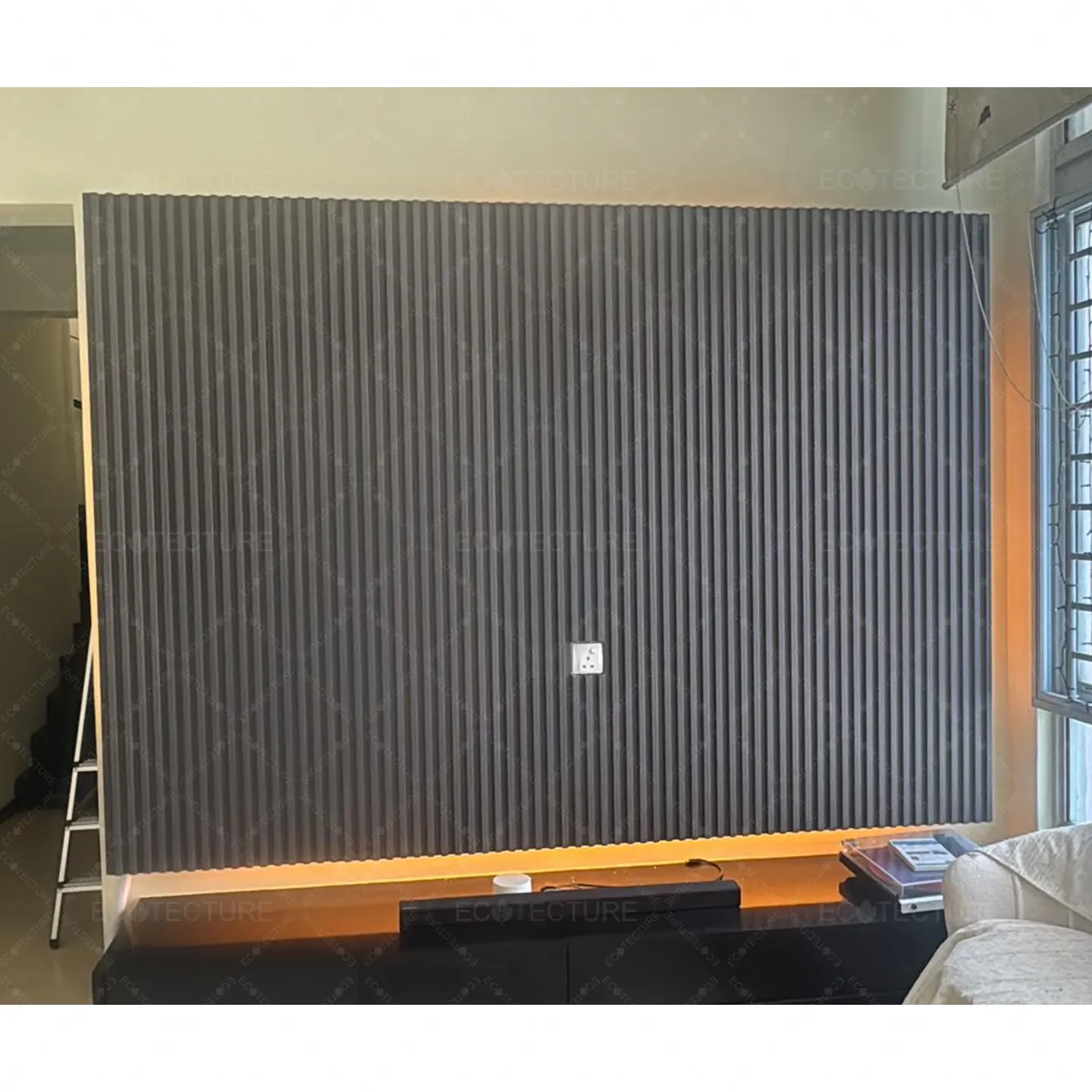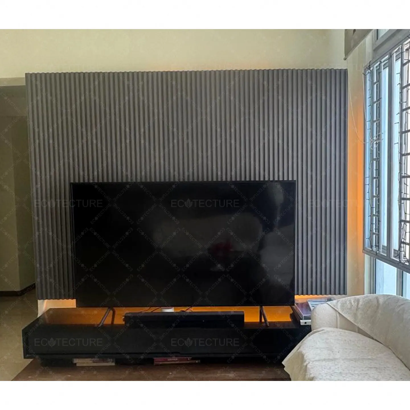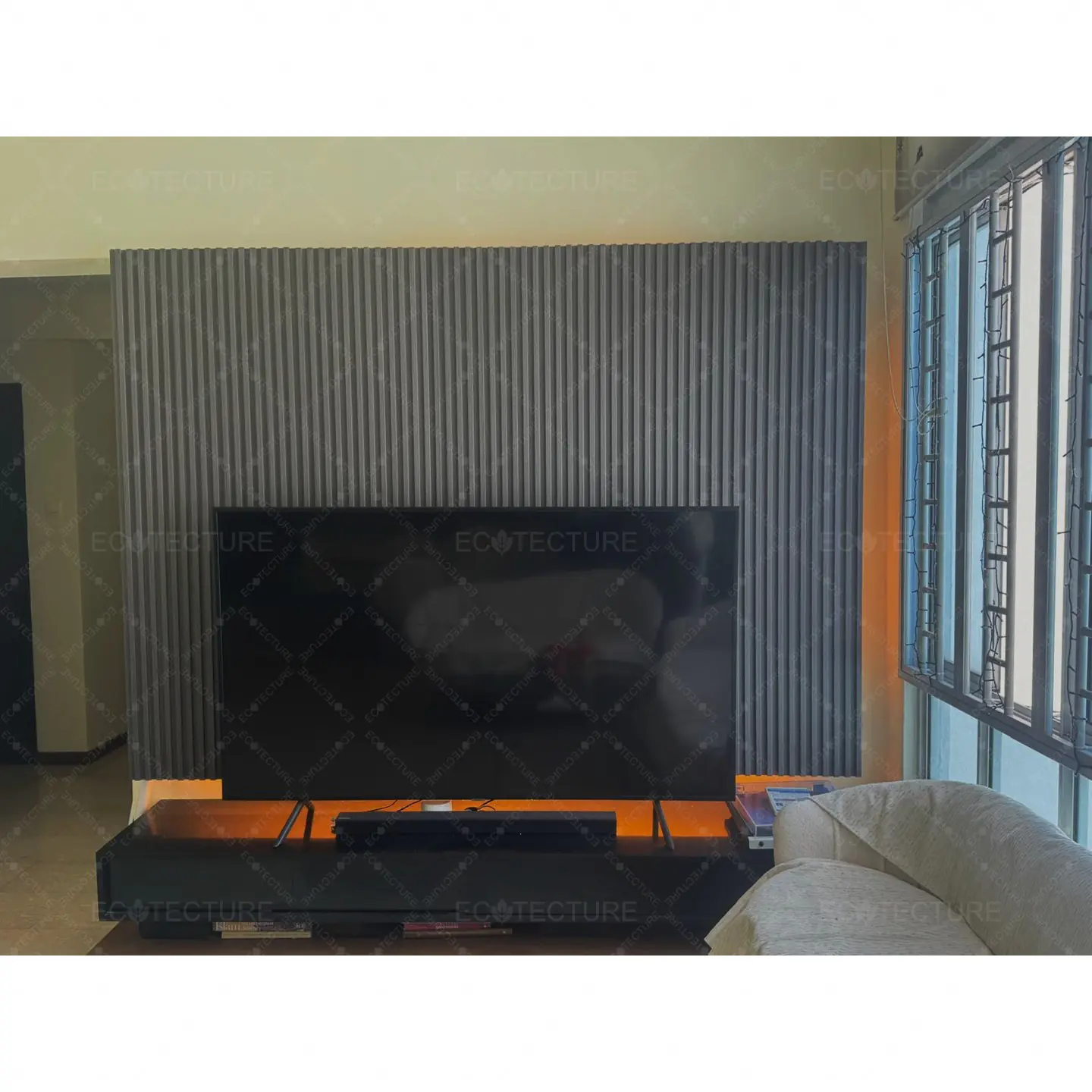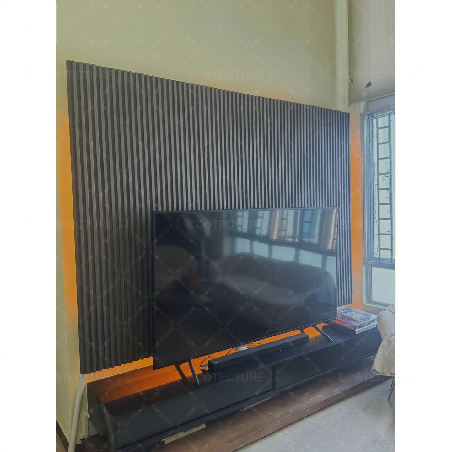A TV console feature wall enhancement at HDB Jurong West featuring Fluted Wall Panel Installation @SQ6. This installation adds texture and depth to the wall, creating a modern and stylish focal point that elevates the overall living room design.