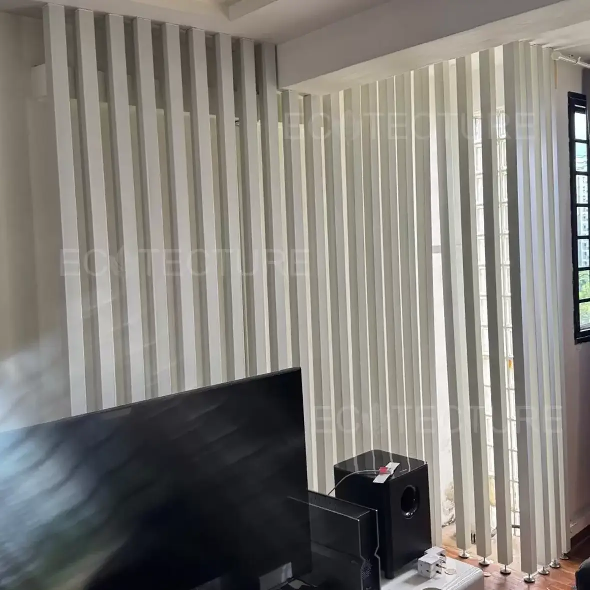 A living room decoration upgrade at HDB Jurong West featuring an Aluminium Tube Divider – Square Tube, also known as a Column Divider. This modern feature element adds structure and visual interest to the space, creating a stylish partition effect while keeping the living area open and spacious.