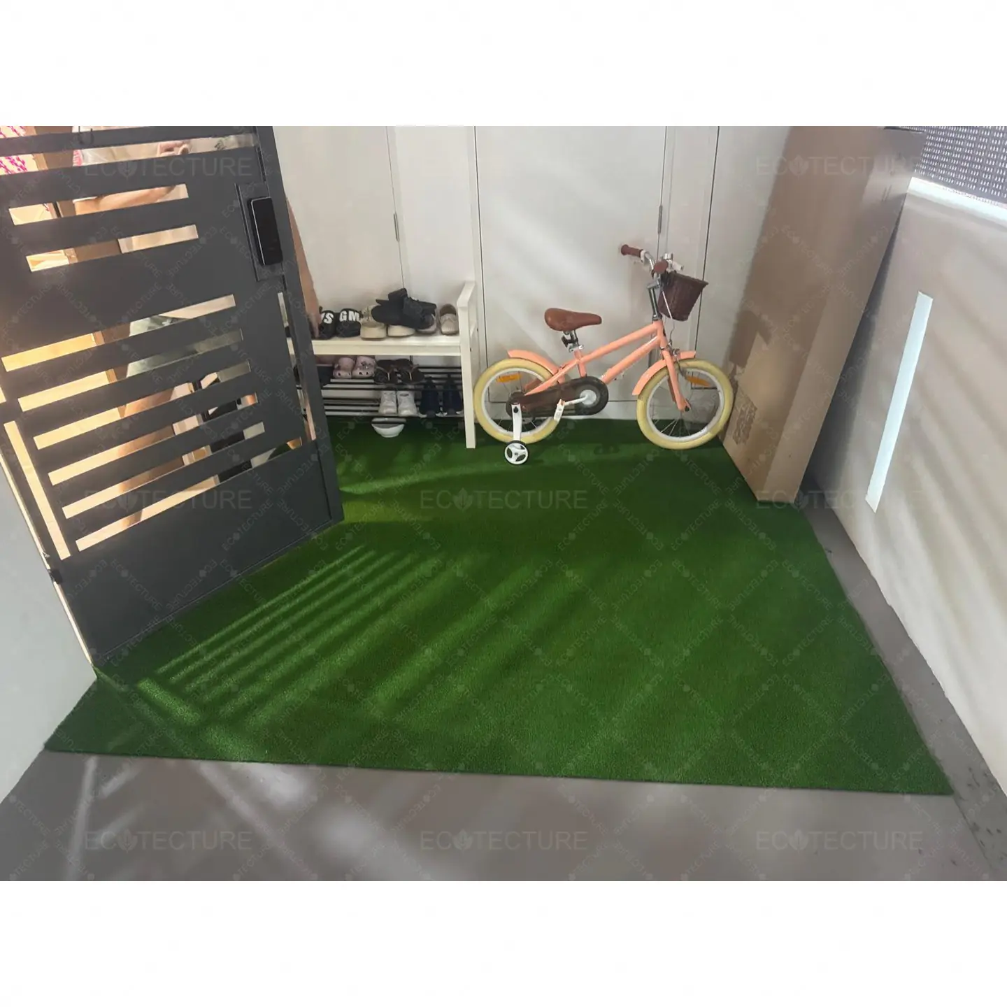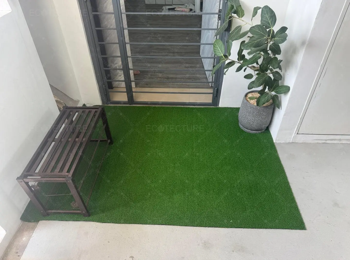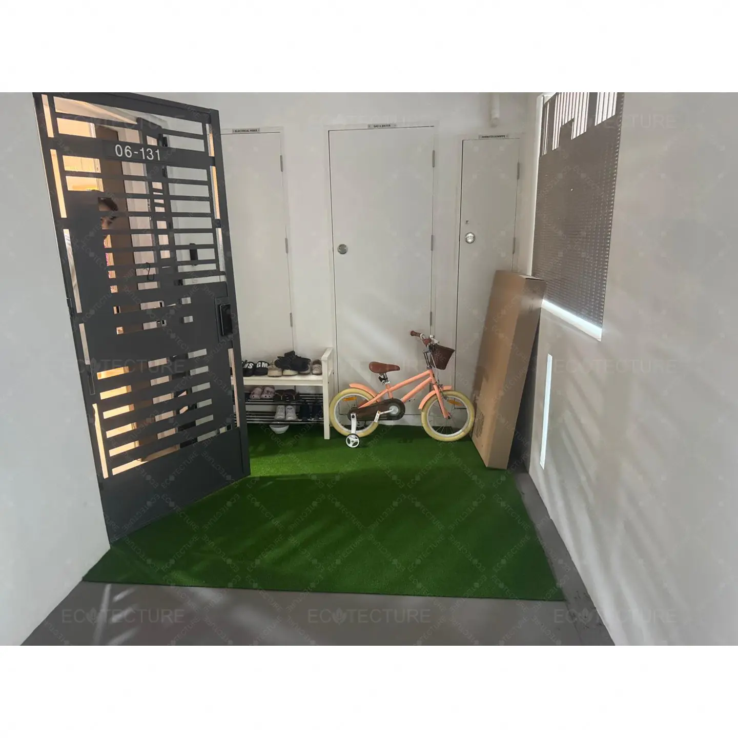 An outdoor entrance enhancement at BTO Tampines featuring EcoGreen 20mm Artificial Grass Installation. This installation introduces a fresh green surface that brightens up the entrance, creating a neat and welcoming first impression.