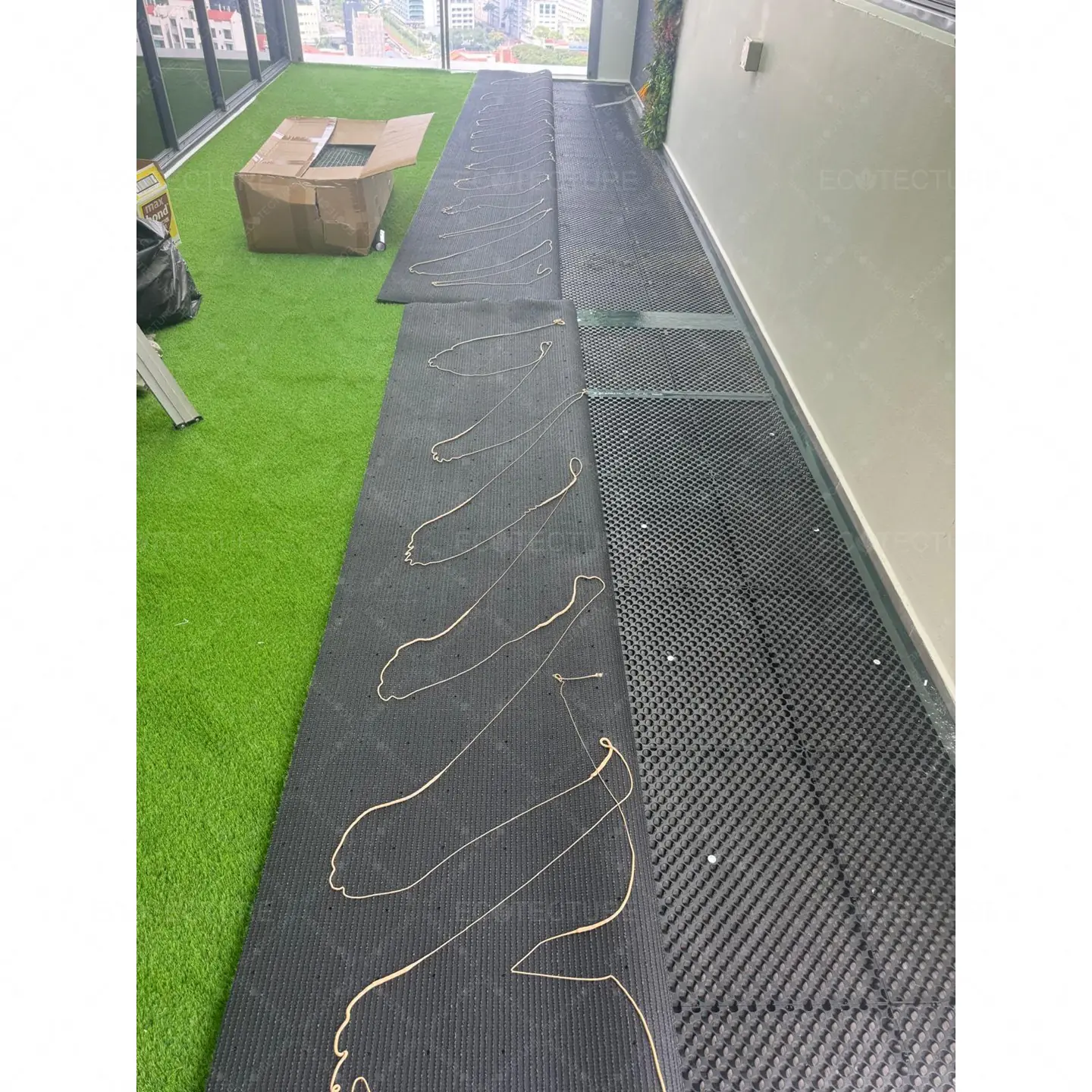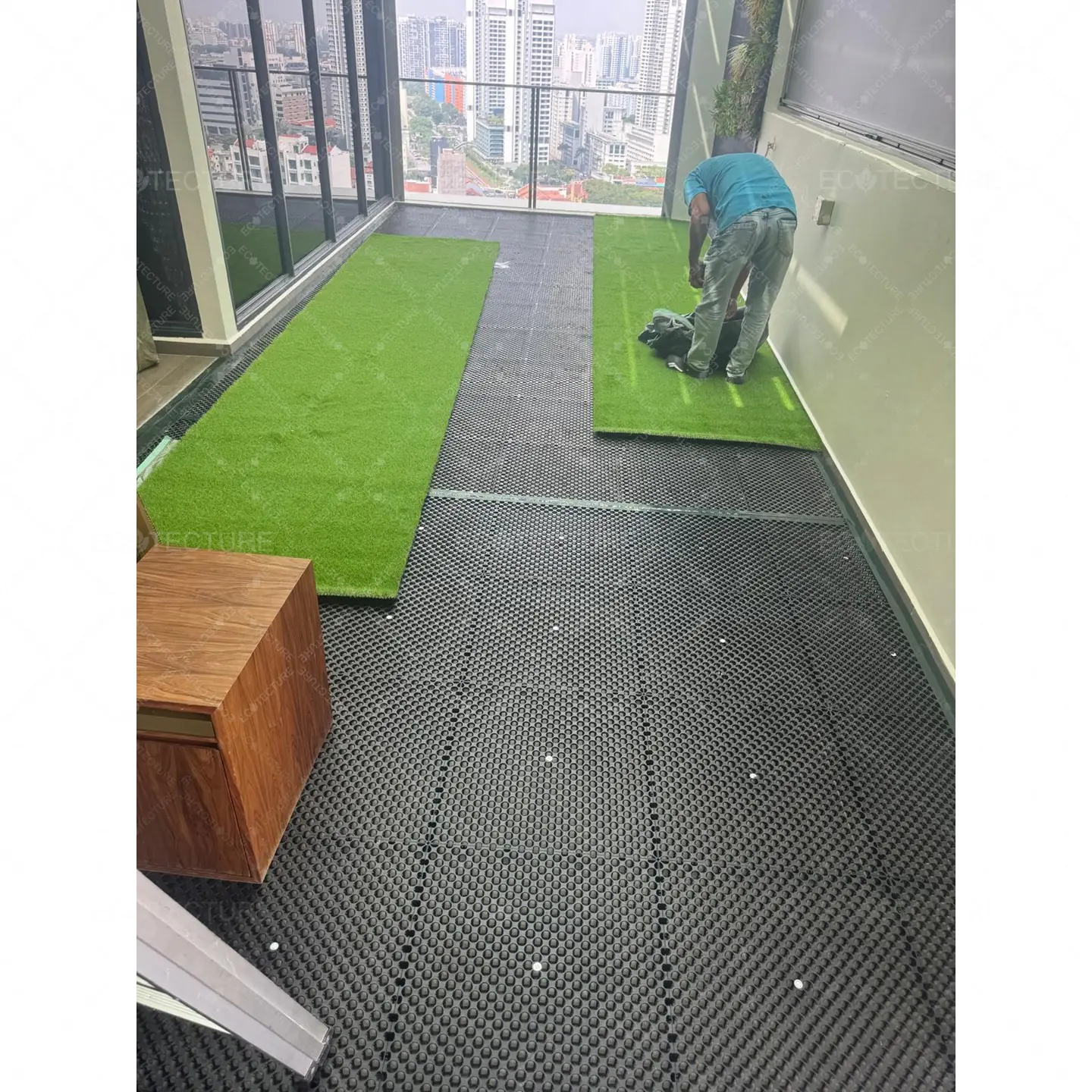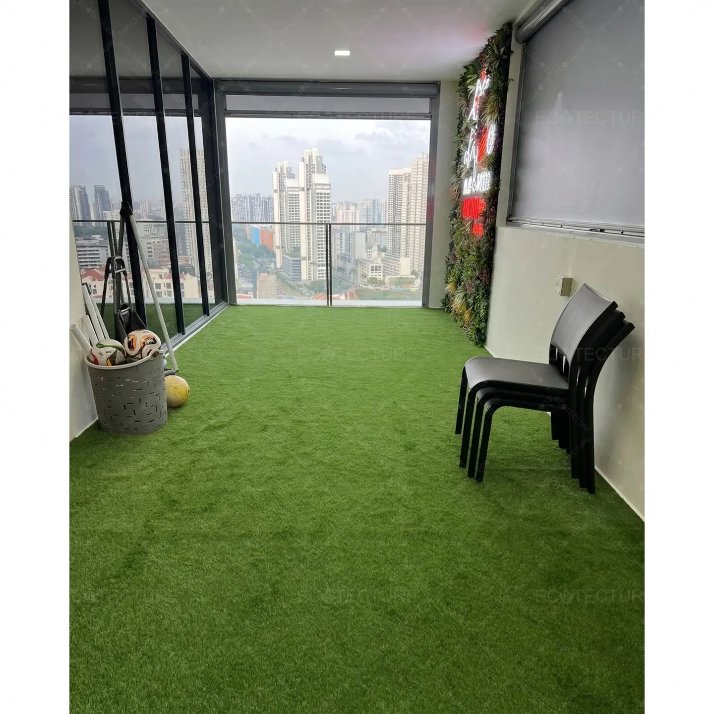 An enclosed balcony enhancement at Condominium Uptown @ Farrer featuring EcoSignature 30mm Artificial Grass Installation. This installation transforms the balcony into a lush green space, creating a more relaxing and visually appealing area within the home.