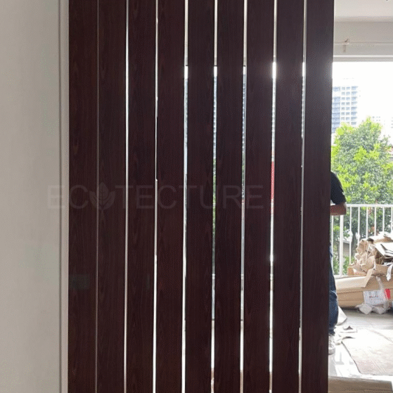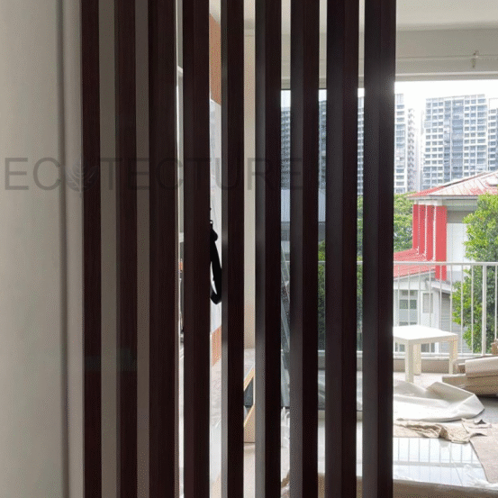 An indoor balcony enhancement featuring an Aluminium Tube Divider – Square Tube, also known as a Column Divider. This sleek installation adds structure and definition to the balcony space, creating a subtle partition while maintaining openness and natural light flow.